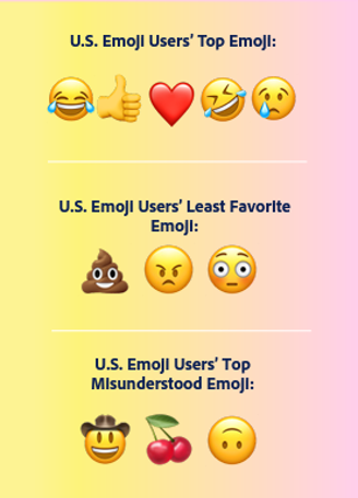 Of course, not all emoji need translation. Expressions of laughter and love remain the most universally popular and clearly understood, Adobe says. And with emoji use now incorporated into Slack, Microsoft Teams and more, using emoji in messages is no longer considered totally unprofessional, with 69% of survey respondents saying they can positively impact a sender’s likability in hybrid workplaces.